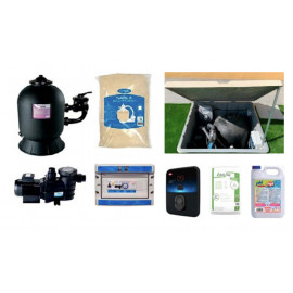 Filtre Pompe 3/4cv Électrolyseur au sel Coffret électrique Trafo 50W Vanne 6 voies Sacs de sables Local à enterrer Filtre Pompe 3/4cv Électrolyseur...